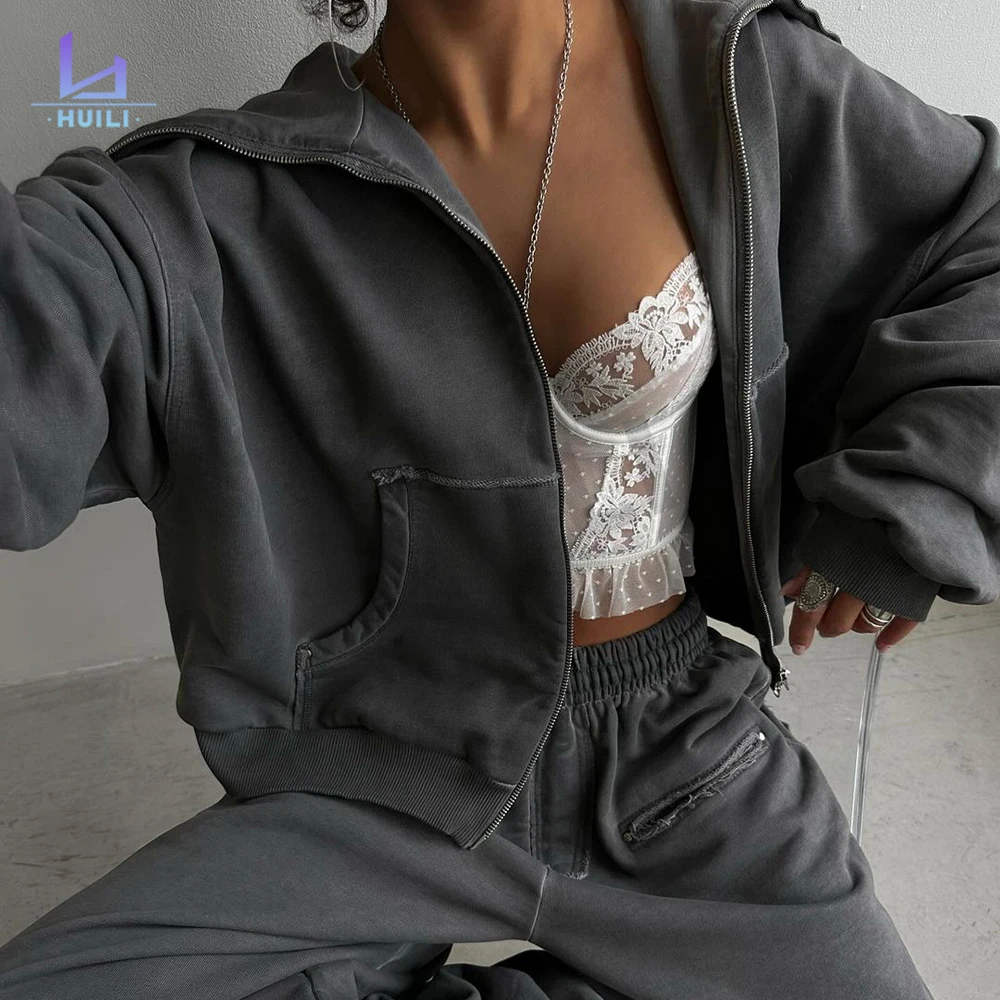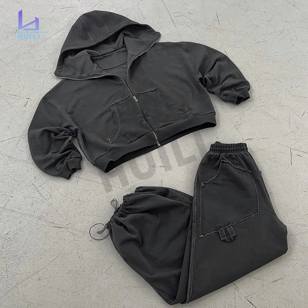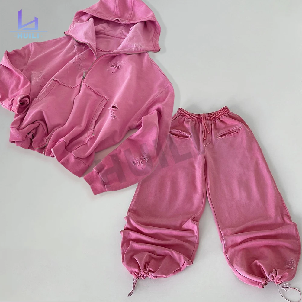 Custom Logo Heavyweight Loose Fit Blank Tracksuits 2 Piece French Terry Zip up Oversized Pink Sweatpants and Hoodie Set Women